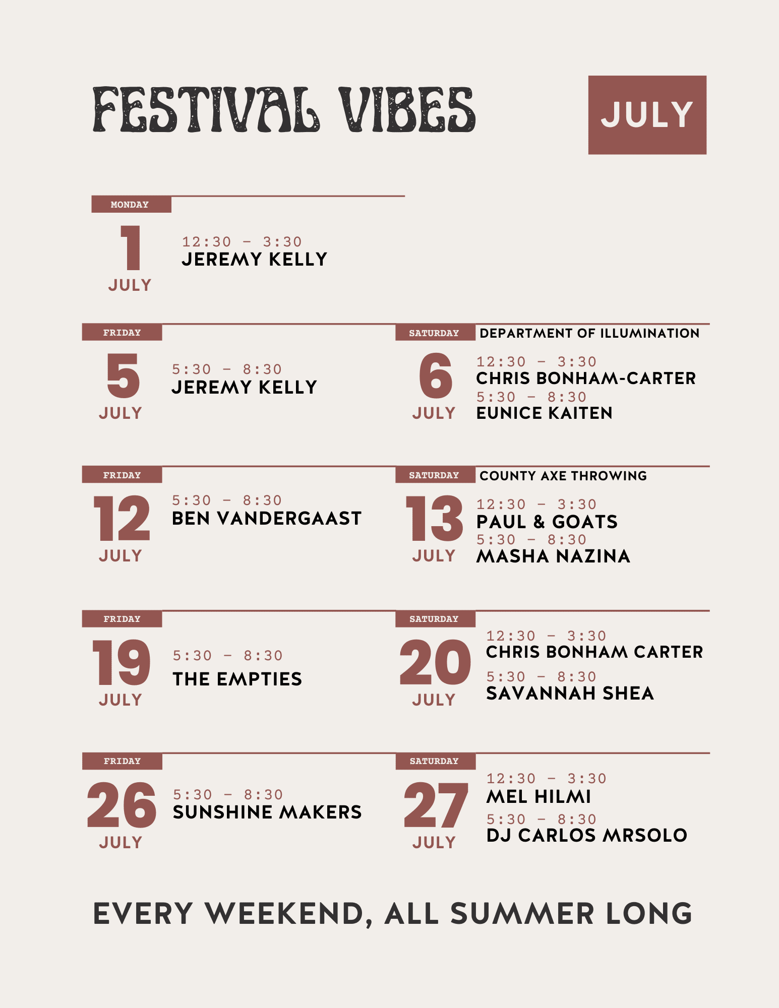 Parsons Brewing Company is launching a summer of Festival Vibes with live music, family-friendly activities, great food, fantastic beverages and lots of space to stretch out. Nothing says summer like sunshine, live music and a tall pint of cold beer (or cider, or wine if that is your vibe). Sat July 26th, Musical Guest: Sunshine Makers - 5:30 - 8:30pm Walk ins are always welcome at Parsons, but consider booking a table, especially if you plan on coming with a group!