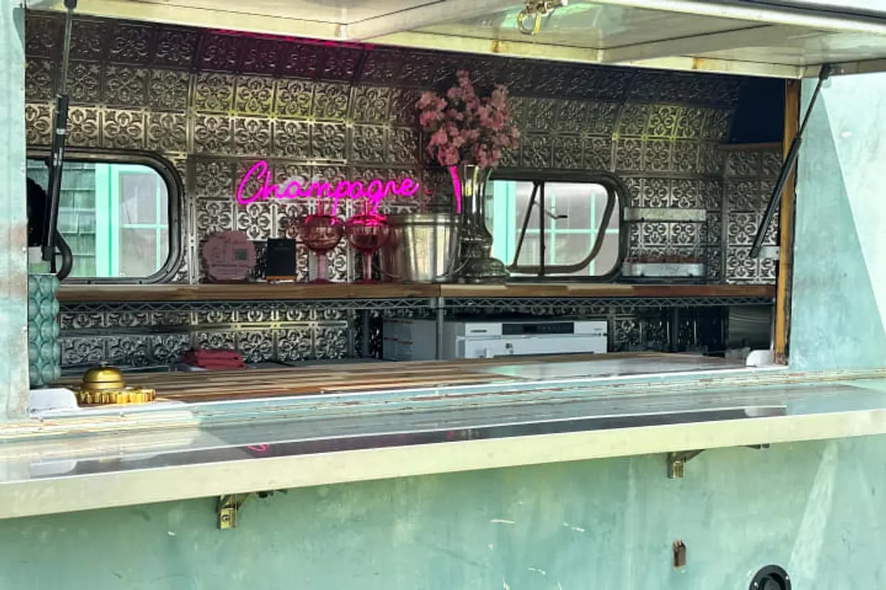 Mobile Champagne Event Bar. Mobile bar rental for weddings, events and corporate. Focused on curated and authentic French champagnes, sparkling and sparkling cocktails. The ‘bar’ is a 20' WWII era (1948) Peerless Glider. This is a true vintage trailer found in California. It’s been off the road since 1956. The inside has been stripped and rebuilt to offer fun champagne experiences. It’s an homage to everything sparkling.