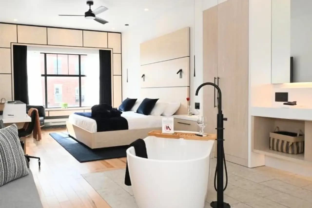 Stay in the heart of Picton at Cribs on Main, a modern boutique hotel located above the beloved Books & Company bookstore on historic Main Street. Our stylish suites feature plush king or queen beds, heated floors, walk-in showers or soaker tubs, and 75" smart TVs with Netflix and cable. Enjoy private parking, fast Wi-Fi, and a pet-friendly stay just steps from Picton’s restaurants, cafés, and shops.