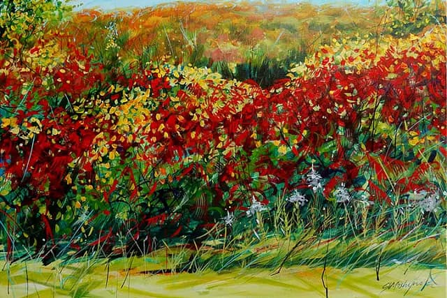 Art Studio showcasing Susan Moshynski's BFA paintings. Vibrant landscapes, loose brushstrokes in acrylic. Offers commissions.